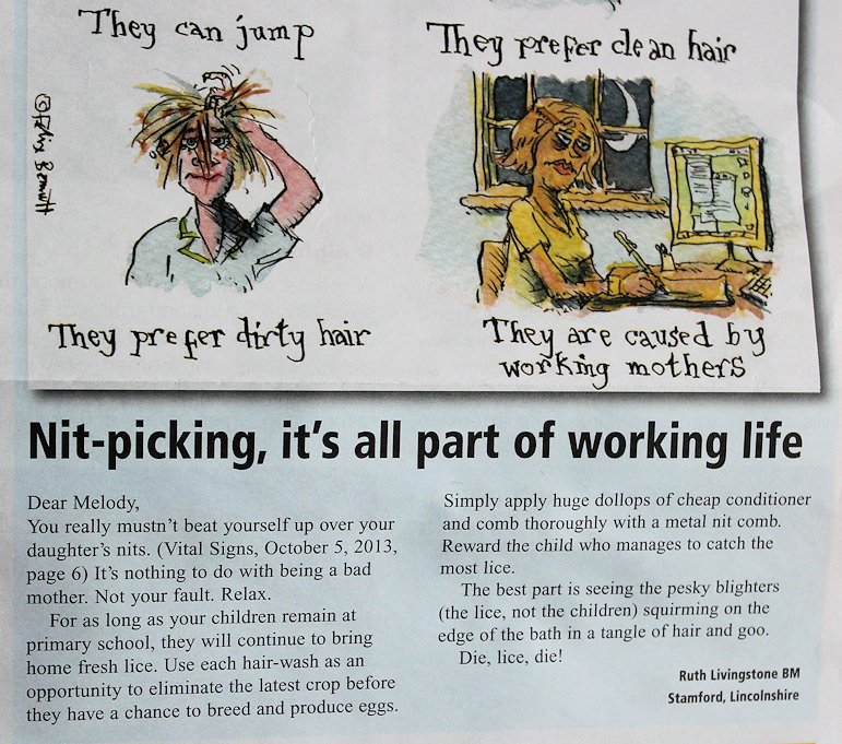 I knew this wasn’t her fault, because nits and head lice are rife in most British primary schools and feeling compelled to respond, I wrote a letter – to her – and sent it via e-mail to the BMA News Review to pass on.