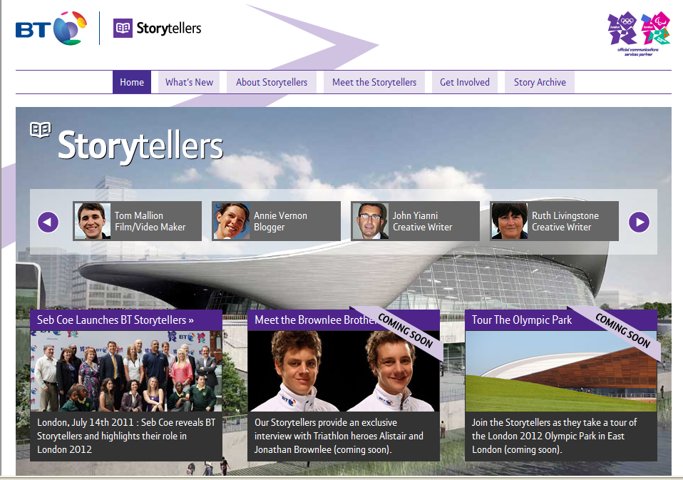 olympic storytellers live site The official BT Olympic Storytellers site is now live, along with details of all the storytellers. They look an intelligent and talented bunch of people. I have no idea what I am doing among them.